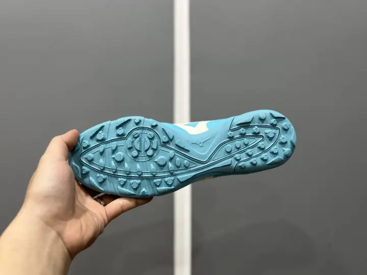 Phần đế giày, có hai loại đinh, sự kết hợp vô cùng tinh tế của nhà sản xuất Mizuno. Trong đó, đinh vòng ngoài là các hình tam giác, làm tăng bề mặt tiếp xúc giữa giày và mặt sân. Còn lại là các đinh tròn bên trong có tác dụng tăng khả năng xoay người một cách uyển chuyển trong các pha tranh chấp với đối phương.